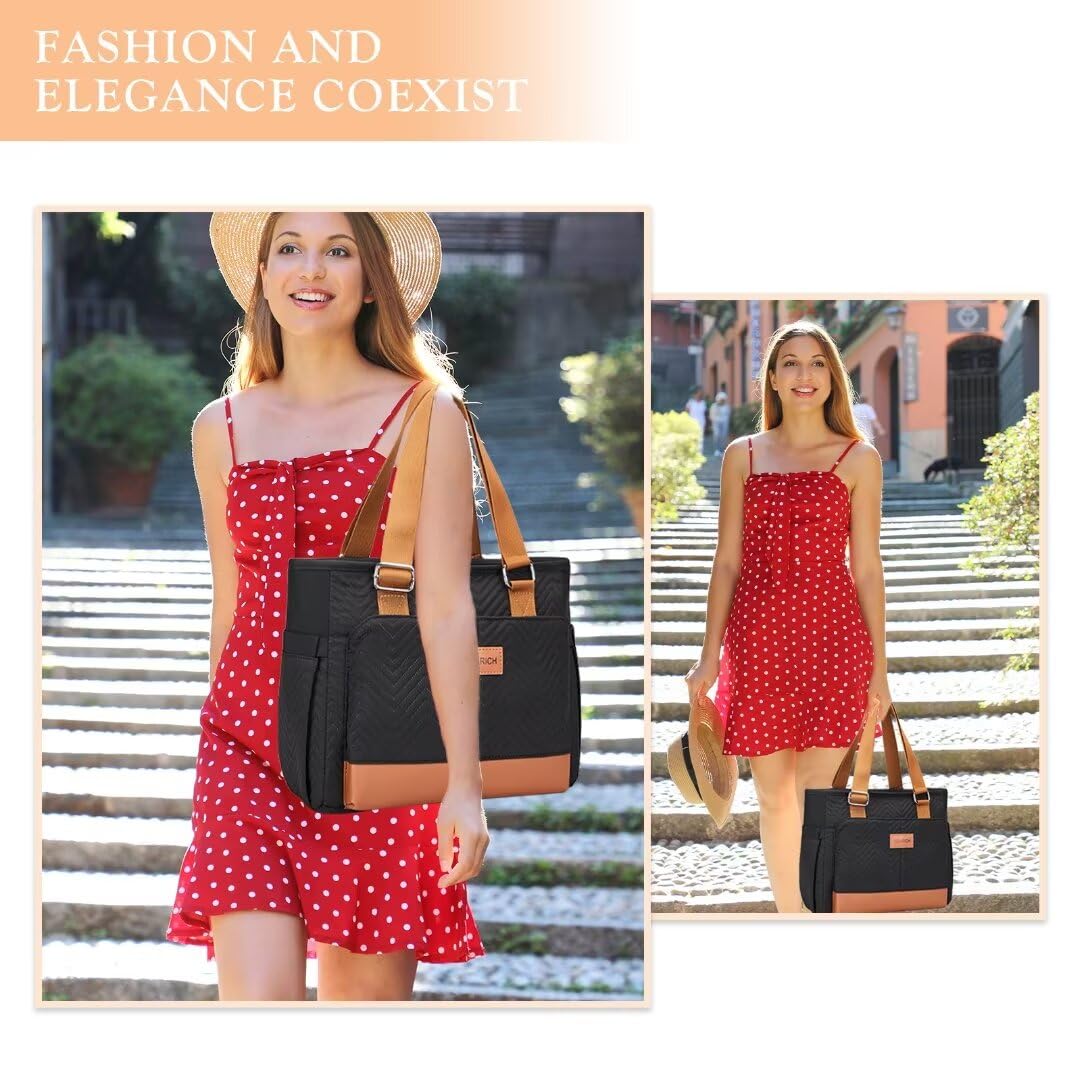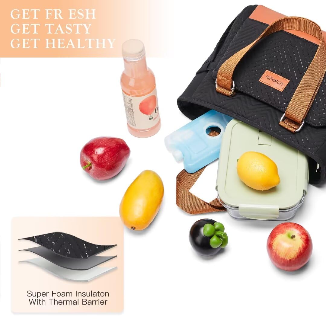 Holuxer Lunch Tote Bag for Women, Large Lunch Box for Work, Leakproof Oxford Lunchbox Shoulder Bags, Fashion Totes Cooler Purse with Storage Front Pocket for Work Picnic, Black Brown Leather 12L